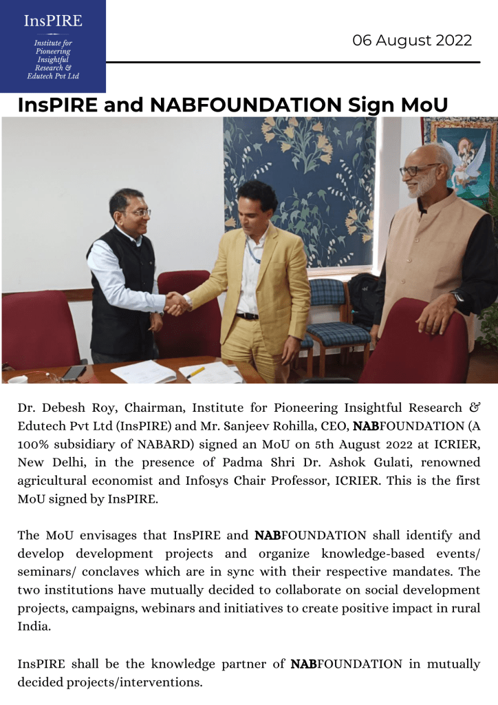 Dr. Debesh Roy is Chairman, Institute for Pioneering Insightful Research & Edutech Pvt. Ltd. (InsPIRE). He holds a PhD in Economics, and has 34 years of experience in policy research, development banking and consultancy. He has held a senior position at the National Bank for Agriculture & Rural Development (NABARD), where he worked for 32 years in various capacities, and gained expertise in the areas of research in agricultural economics and the rural economy; rural infrastructure financing; microfinance and livelihoods; financial inclusion; institutional development of rural financial institutions; and rural credit planning.