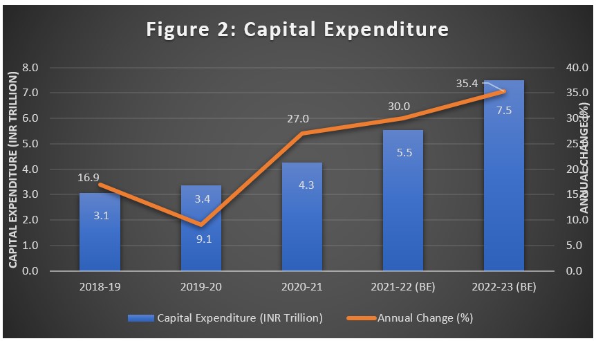 The Budget has done well to focus on the achievement of high, sustainable and inclusive growth. It has proposed a significantly higher allocation of 35.4% to capital expenditure to INR 7.5 trillion compared to INR 5.54 trillion in the previous year’s Budget, which is a continuance of strong growth in capital expenditure during 2020-21(actual) and 2021-22 (budget estimate) (Figure 2).
