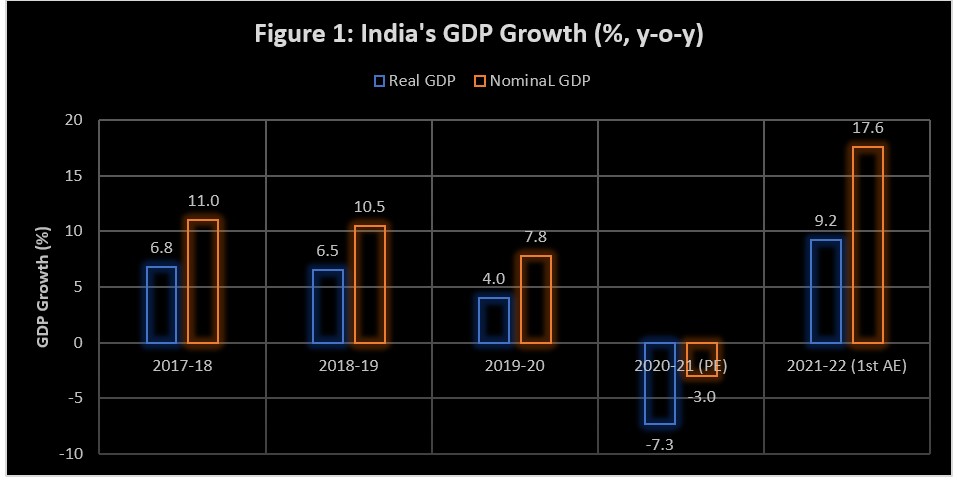 The Indian economy is poised to grow at 9.2% in FY22 (Figure 1) as per the First Advance Estimate of the country’s Gross Domestic Product (GDP) (at 2011-12 prices) estimated by the National Statistical Office (NSO), Ministry of Statistics and Programme Implementation (MoSPI), Government of India. This is against a pandemic-induced contraction of 7.3% suffered by the economy in FY21. The real GDP is estimated to increase by 1.3% over that of the pre-pandemic year (FY20).