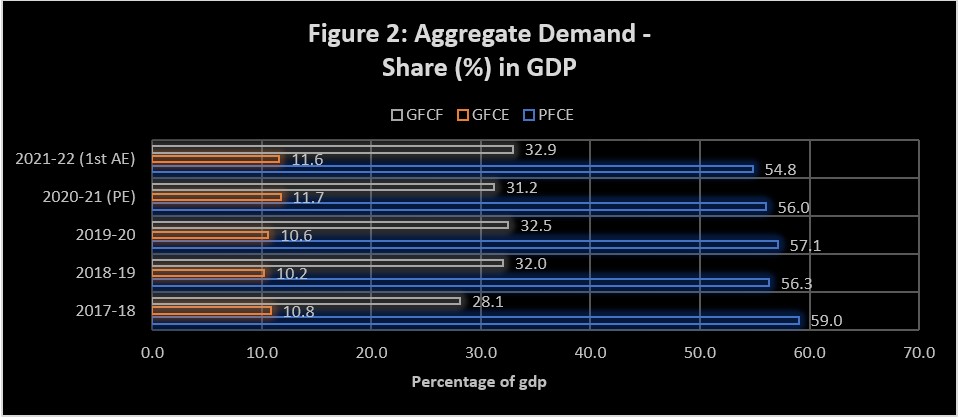 On the expenditure side, Private Final Consumption Expenditure (PFCE) is still 3% below the pre-pandemic level, and its share in GDP is observed to be on a declining trend from 57.1% in FY20, to 56% in FY 21 and further down to 54.8% in FY22 (Figure 2). This is a cause for concern as India’s growth story has essentially been a consumption led one. Loss of lives, livelihoods, jobs and income caused by the pandemic have depressed private consumption.