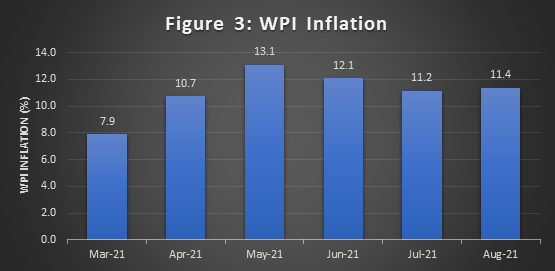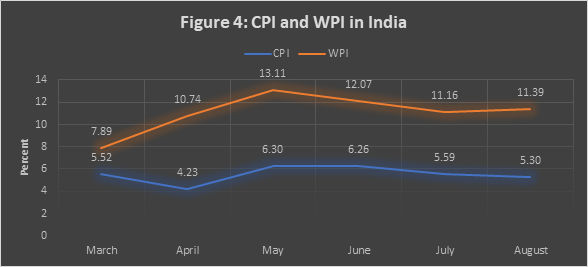 India’s wholesale price index (WPI) inflation increased from 15.1 in April to 15.9% in May, the highest level since August 1991, driven by soaring inflation of primary articles (15.5% to 19.7%) and fuel and power inflation (38.7% to 40.6%) (Figure 7). The wholesale inflation of manufactured products, however, eased from 10.9% to 10.1% (Figure 7).
